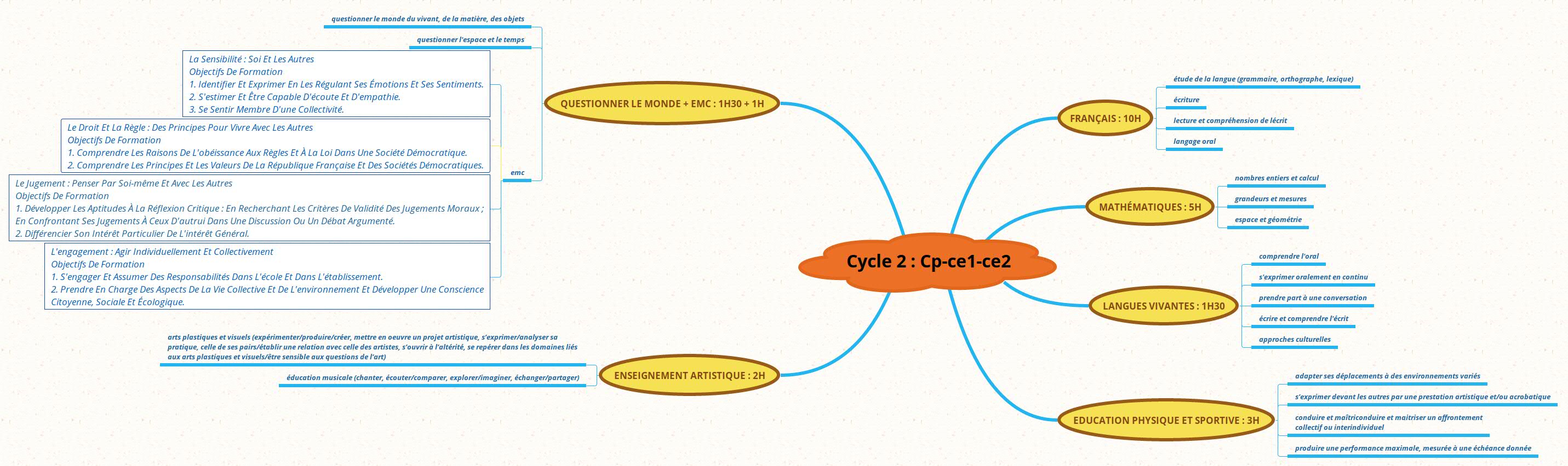 Une petite carte mentale des « enseignements » des Nouveaux Programmes 2016, pour le cycle 2 (domaines et sous-domaines) ainsi que le nombre d’heures associé à chacun.